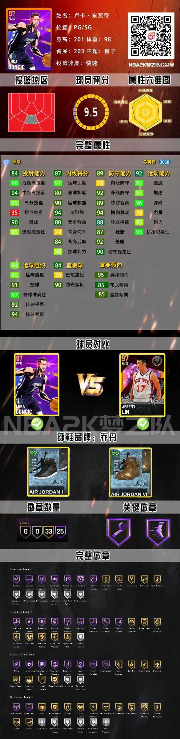 这张银河东契奇真的很不错,他的三分和速度全都达到了95,而且内线终极也算优秀,投篮速度要比之前那样95粉钻快了很多,而且还自带紫色远程炮台,在投射上一跃成为顶级水准。此外,虽然作为白人球员,东契奇在建模上并不是很宽大,但2米01的身高打控卫还是很舒服的,所以我将他和林书豪等球员并列,是目前游戏中最好的一号位选择之一!
