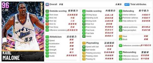 这张粉钻马龙创造了一个新记录,他是第一个主题包里没有出任务的球员,这也让本就在MT中不太受欢迎的“邮差”更加无人问津了。不过这张马龙的属性还不错,尤其90双速在内线中算是顶级了,而且还有紫色第一步,喜欢小个阵容的话可以考虑用他打中锋。