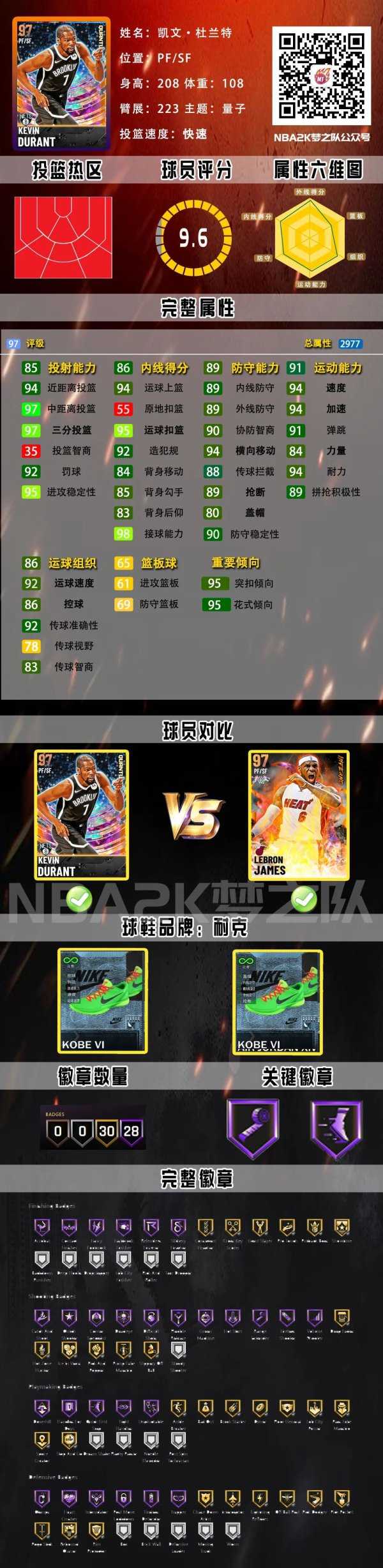 身穿篮网球衣的银河KD登场,如果说上面的077是目前最好的控卫之一,那么这张KD就是目前最好的锋线球员之一,与银河老詹、小卡鼎足而立!银河KD的投射能力直接毕业,唯一遗憾就是热区猎手只有金章。94的双速正好可以配上一双科6的速度鞋,可以直接让他起飞,而且28枚紫章也是排面十足,在次世代他的紫章更是多达31枚,是当前徽章最多的球员!