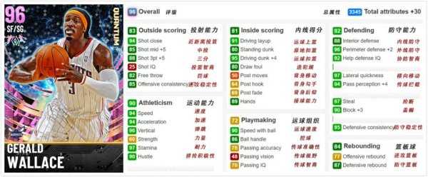 先来快速过几张粉钻,猫王华莱士一直都是历代2K中的优质侧翼,这张卡同样有着不错的性价比,三分和投射均可,而且速度很快,防守更是硬的一笔,还拥有16紫章,不过没有远程炮台,需要手动补充。