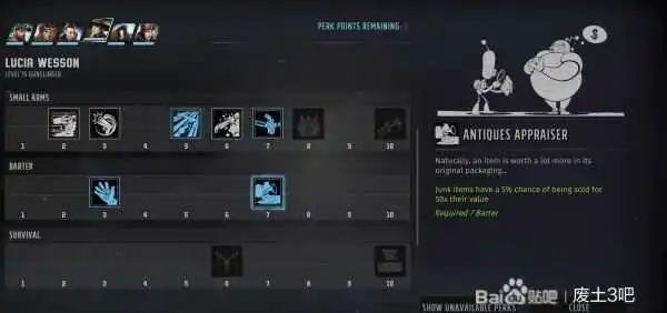 1.Barter(讲价)点到7级,出Antiques Appraiser(古董鉴定师)Perk,学会后交易有几率卖出价格50倍。