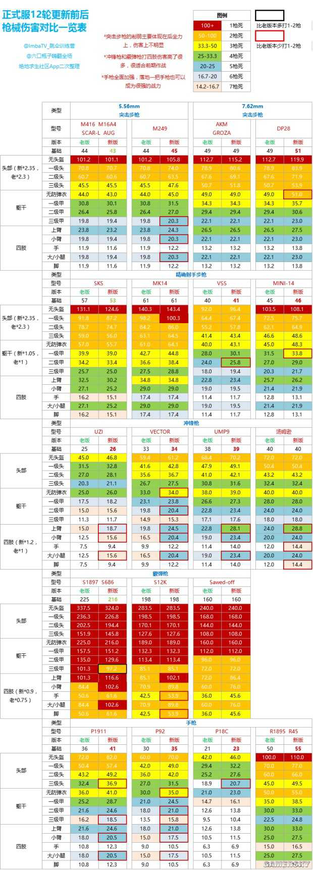 《绝地求生》第12轮更新后,武器性能是改动最大的地方,而新老版本伤害有何变化相信大家还没弄明白,下面小编带来“六口瓶子嗨翻全场”分享的《绝地求生》新版本武器、命中伤害对比解析,赶紧来看看吧。