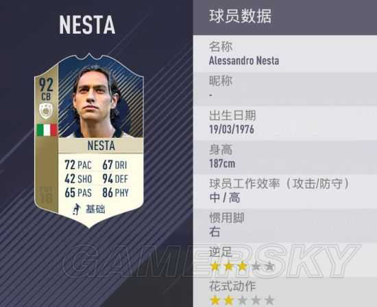 游戏中的内斯塔综合能力为92,虽然速度稍慢,体能也不算十分充沛,但是各项防守数据均在90以上,是一位非常优秀的中后卫,喜欢内斯塔的球迷可要及时入手了。