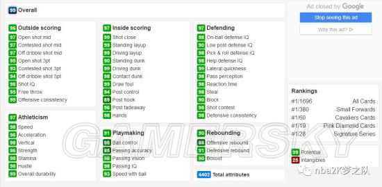 扣篮方面,90原地+99突扣+98隔扣+100双扣倾向+98弹跳,再加上詹皇“犯规”一般的宽大建模,使他的外线突破几乎无法阻挡,能对敌人内线造成成吨的伤害。其它方面,粉詹的速度为移动98、加速96、运球93,其中运球速度的提升有很大帮助,搭配上老詹超强的传球能力(98),简直就是控卫的不二人选。
