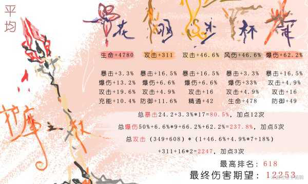 平均:每个圣遗物歪一手,共20次有效强化,副词条增量和初始值取均值,暴击上限80%