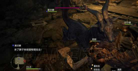 解决了人面鸟后进入大门,这里还能与之前失散的士兵汇合,进入大厅后就会遭遇有羊头和狮子头的怪物了。这只怪物因为队友实在很多,没有什么难度,按F爬上怪物的身体之后一路平砍,体力值不够时跳下等待回复,之后继续平砍即可。将怪物击杀后序章结束。