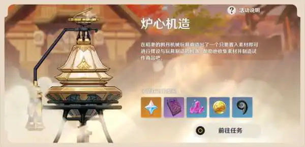 活动期间,帮助在稻妻的枫丹机械玩具商伯特兰收集素材并制造试做商品,可以获得兑换券。使用兑换券可以兑换动态机器人摆设。完成指定挑战后即可获取原石、大英雄的经验、武器突破素材、摩拉等奖励。