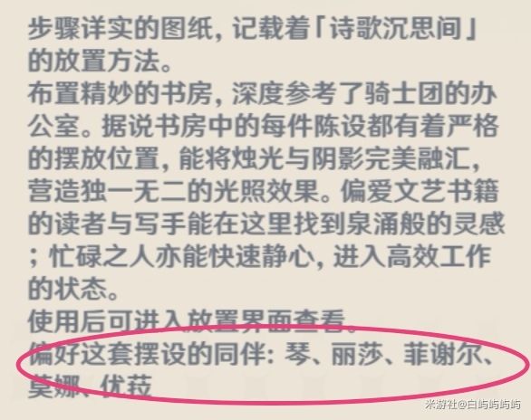 每位同伴都有自己偏好的摆设套装 在兑换图纸前可以看到偏好这个套装的同伴 收集并放置对应套装后可以获得对应同伴的回礼喔!(注:摆设套装不完全等于赠礼套装目前只有在阿圆那里购买的图纸所获得的套装才有赠礼哦)