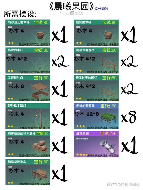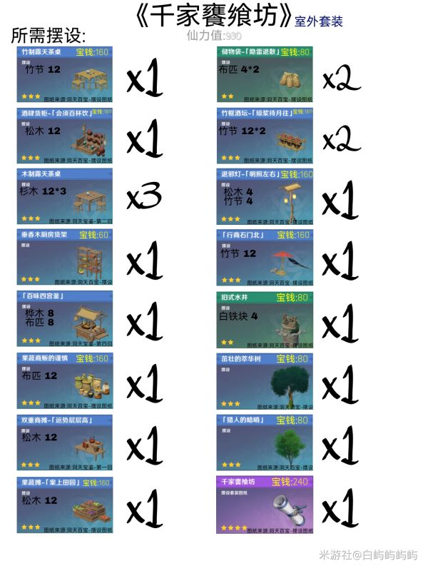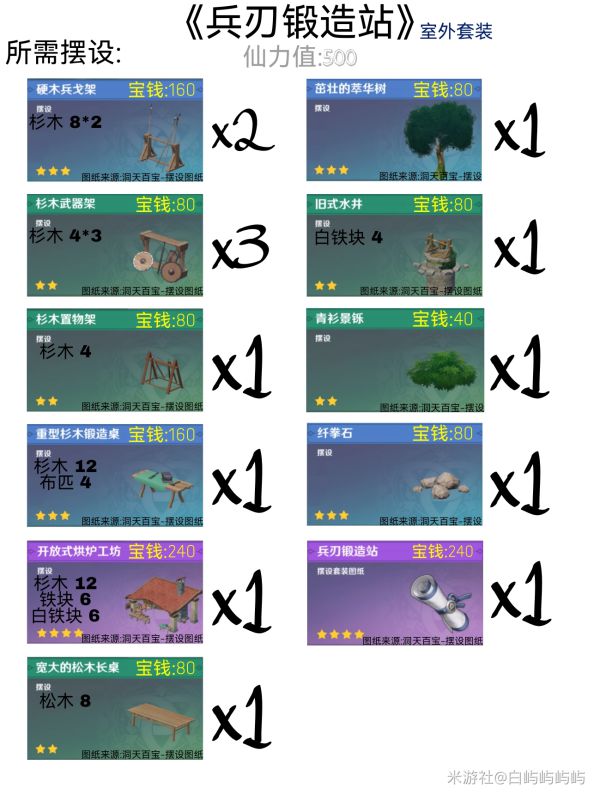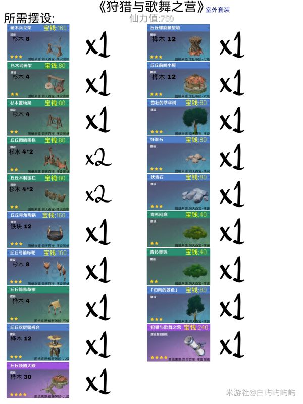共需材料:竹节*52 松木*40 杉木*36 布匹*28 桦木*8 白铁块*4