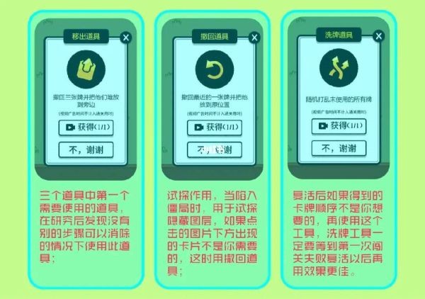 洗牌道具:复活后如果得到的卡牌顺序不是你想要的,再使用这个工具,洗牌工具一定要等到第一次闯关失败复活以后再用效果更佳。