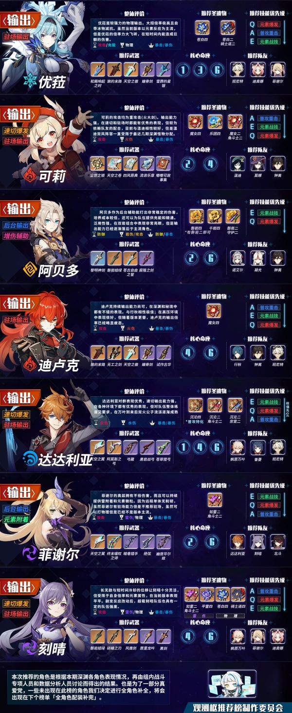 需要说明的是,本榜单仅针对深境螺旋。(但是因为风来人活动对角色评价有一定影响,所以有些也做了标注)。不是以深境螺旋为目的而养成的玩家可以任意选择自己喜欢的角色培养,所有角色的配装也都是经过斟酌决定的。关于武器问题,没放在上边的武器并不代表不能使用,只是单纯的格子太少放不下了。大致是按照五星武器2~3把+四星武器3~2把进行推荐的。