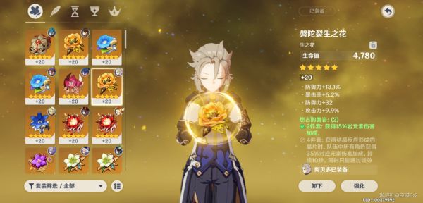 建议二岩二乐团同时加强岩伤和护盾强度,因为阿贝多大招加成在二命之前都是纯攻击力加成,伤害实在太低了,而且释放用的时间很长,所以舍弃大招专修战技伤害。