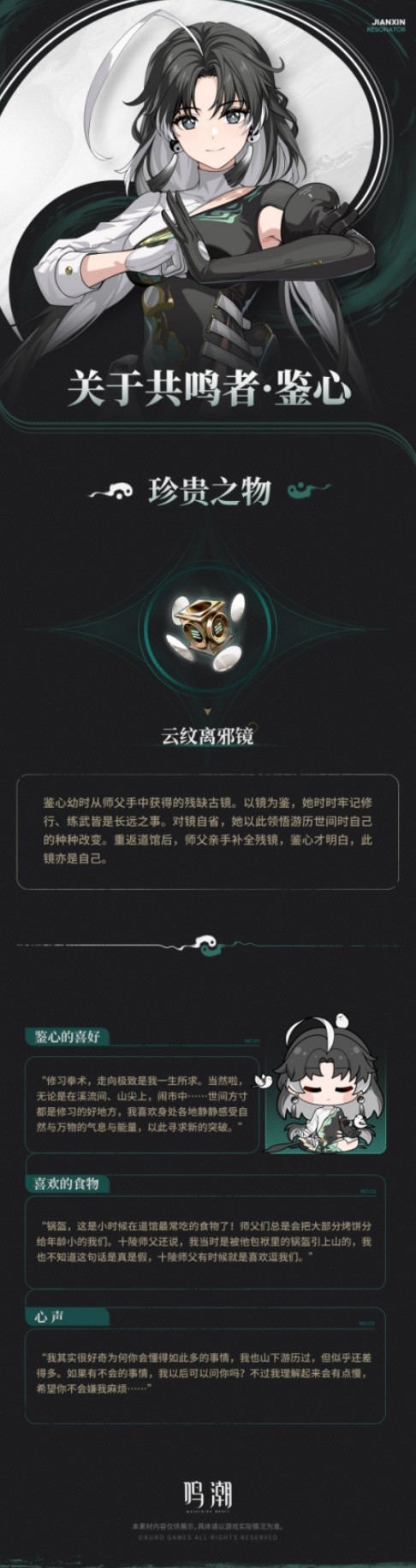 《鸣潮》官方发布了共鸣者鉴心的角色展示。鉴心呆毛的用法是?鉴心打工的秘密和她的心声?鉴心的故事大揭秘!