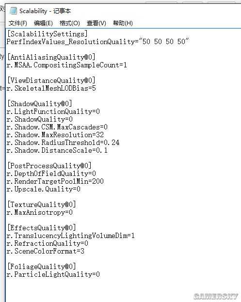 4、打开第3个ini文件(Scalability.ini)依旧取消勾选只读,粘贴以下全部内容。(以下这些内容只在最低配置中应用)。