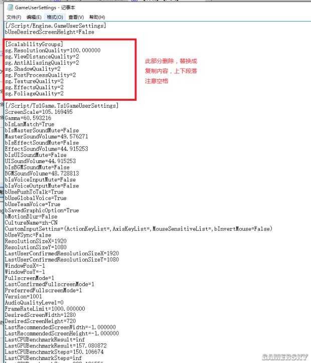 2、然后打开(GameUserSettings.ini)文件,复制粘贴以下内容并进行替换。