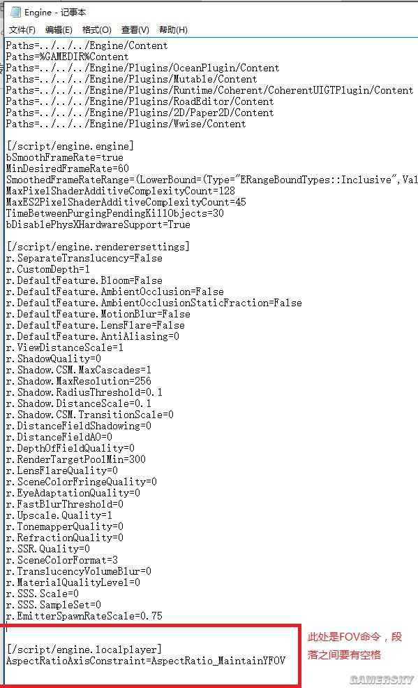 FOV选项开启或者关闭,打开Engine.ini文件,在最下方粘贴以下内容。