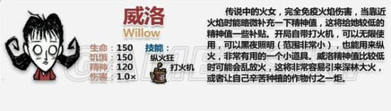 威洛靠近火堆时可以少量增长san值而且不会受到火焰的伤害,并拥有一个耐久无限的打火机,可以点燃物品,但是火焰半径不大。但是她也有缺点,就是她的san值上限不高,而且当她san值下降时会自动点燃身边的东西 (尤其是在晚上)。