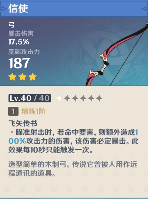 武器副属性爆伤,要害部位增伤,对于一个喜欢打头的弓箭手来说,还是蛮爽的,每一箭都能获得伤害加成。瞄不准喜欢左键普攻的玩家不建议使用,然而弓箭手打头的收益是真的高。