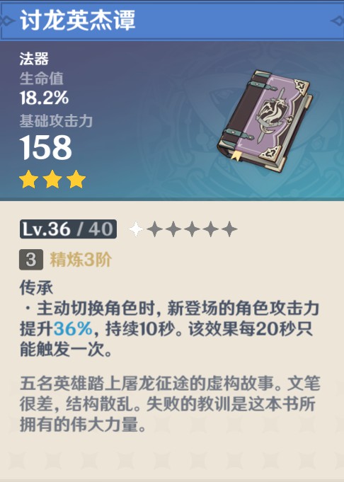 副属性生命,很适合芭芭拉等奶量受生命值影响的角色,切人技能持续10秒,足够大部分角色打出一套爆发。只有由佩戴者切换至其他角色时,才会触发技能,这个效果搭配上面那个武器,可以更轻松的一箭击杀丘丘人。(为什么我这么想要一箭干掉它们?别问,问就不知道。)