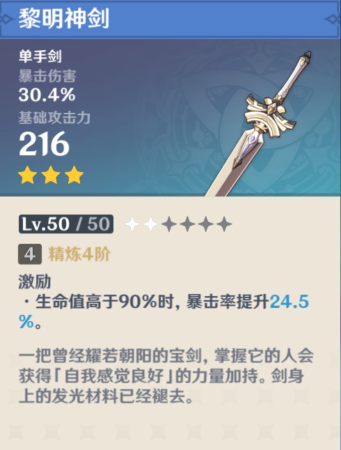 副属性爆伤,技能加暴击,和战狂圣遗物两个方向,一个要求血多,一个要求血少。对于我这种喜欢安全感的玩家来说,当然是血多点好啦,而且带上我可爱的芭芭拉,30秒一次回血,一次回半管,爽。很暴力的一件武器,毕竟暴击是真的猛,两件战狂加上一把黎明,就已经30%暴击了。