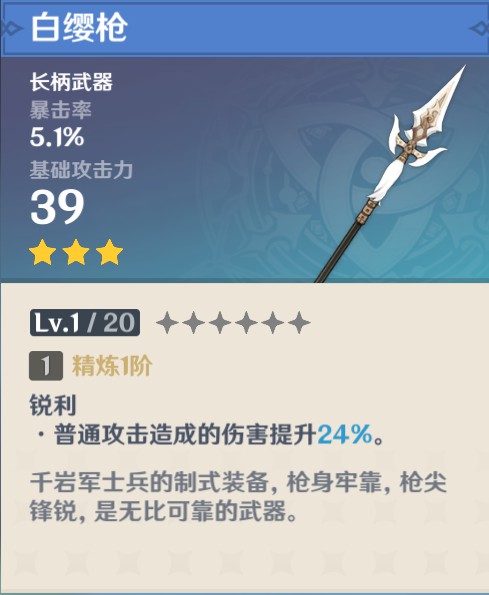 副属性暴击,朴实无华的技能,就摁增伤,很适合平民战神香菱的一把武器。锐利的枪,锐利的眼。速速与我击枪!!