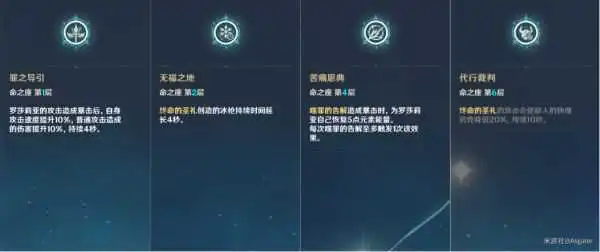 PS:在配合优菈时,由于该天赋的最大持续时间为5秒,且优菈元素爆发(凝浪之光剑)的光降之剑爆发需要积攒7秒。因此如果是在优菈释放元素爆发前使用罗莎莉亚使用元素战技提高队伍暴击率,那么此时光降之剑的爆发是无法享有这一暴击率的提升的。所以,如果想要提升光降之剑爆发的暴击率,那么可以选择在即将爆发时切换罗莎莉亚再切换其触发该天赋。