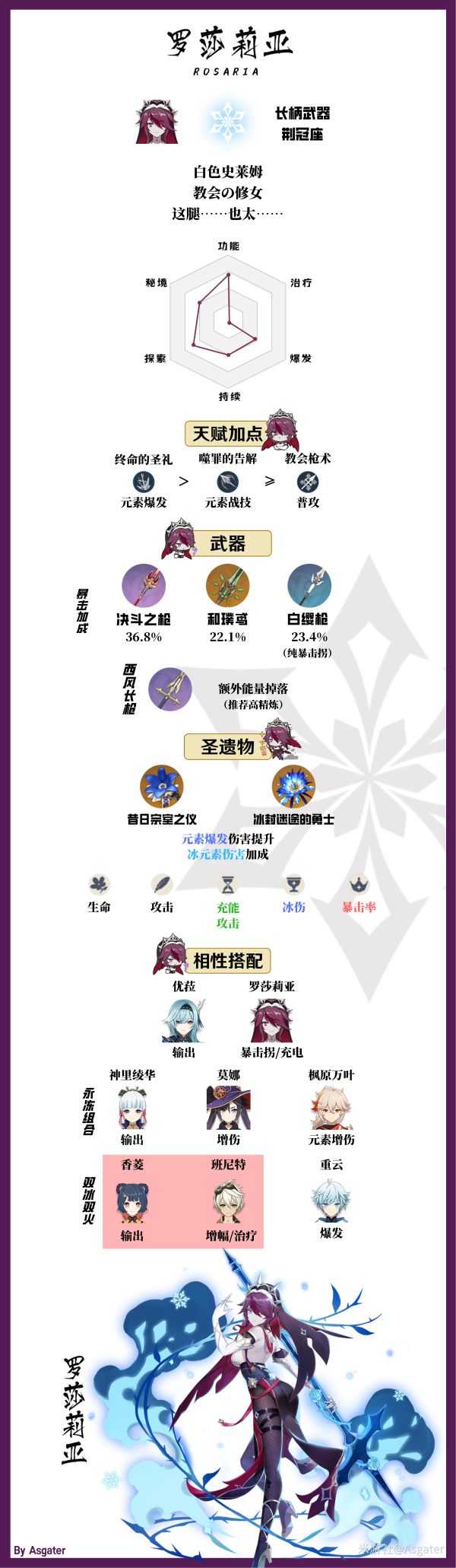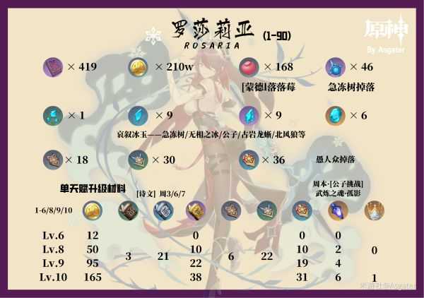 《原神》罗莎莉亚是冰属性的四星角色,不少玩家在获取该角色后不知道如何培养,下面请看“Asgater”带来的《原神》罗莎莉亚一图流培养指南,希望能够帮助大家。