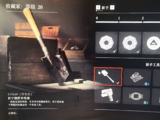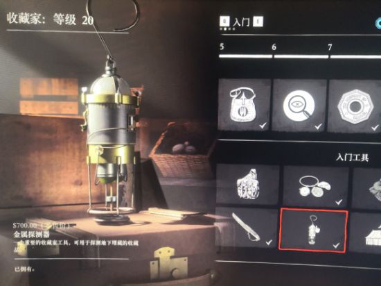 有了网址之后,可以对照网址上的位置去找东西了。1-5级什么心思都不要想,先把几套卡牌和花找全了。一定要成套的找,因为卖给夫人卖成套的又有钱也有经验,一套经验1500,非常舒服,等到了5级一顶要买铲子和金属探测器,如下图: