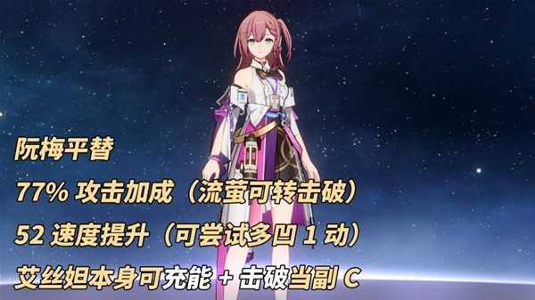 艾丝妲也是火属性可走击破路线当副C,顺带为流萤提供攻击力(转击破)、速度(多凹1动)。