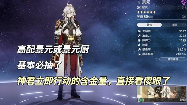 第一点,现有角色中召唤物行动慢的仅景元一位,灵砂、托帕目前来看都无抽取星期日的必要性。高配景元或景元厨,可抽取。