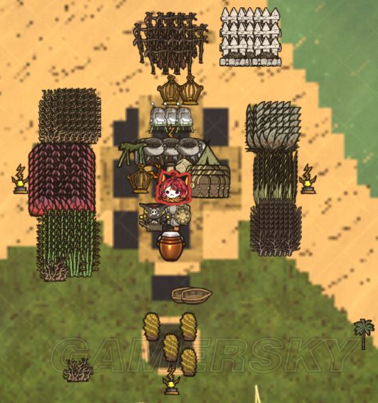 分别是晒肉架,农场和作物区,还有一个区域没能围起来。。。采矿采得心累。。。毕竟木头好刷而石头只能一个一个敲。。。我非常喜欢小蕨类植物的盆栽,以后会更多用到它们来装饰。蕨类植物据说一个世界里数量有限,不过风滚草可以开出来,所以应该还好。而且在海难跳世界的话,巨人统治的洞穴也会重置,所以,给家装带来了方便。