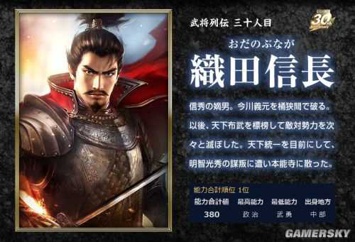 织田信长(Oda Nobunaga)1534年6月23日-1582年6月21日,幼名吉法师,通称三郎,著名绰号为第六天魔王。出生于尾张国(今爱知县西部)胜幡城(一说那古野城)。日本安土桃山时代之初势力最强大的战国大名,于1568年至1582年间,作为掌握日本政治局势的领导人,推翻了名义上管治日本逾200年的室町幕府,并使从应仁之乱起持续百年以上的战国乱世步向终结。织田信长是日本战国时代的三英杰之一(另外两人是丰臣秀吉及德川家康)。