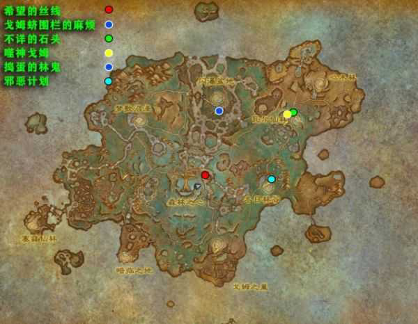 炽蓝仙野一共有6个,第一个,希望的丝线、坐标(48.5 :50.4);第二个,戈姆蛴围栏的麻烦、坐标(51.0 :35.0);第三个,不详的石头、坐标(64.9 :35.2);第四个,噬神戈姆、坐标(62.2 : 36.1);第五个,捣蛋的林鬼、坐标(51.0 :35.0);第六个,邪恶计划、坐标(60.6 :51.5)。