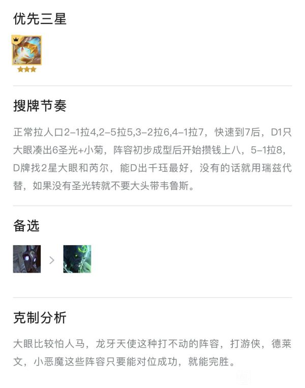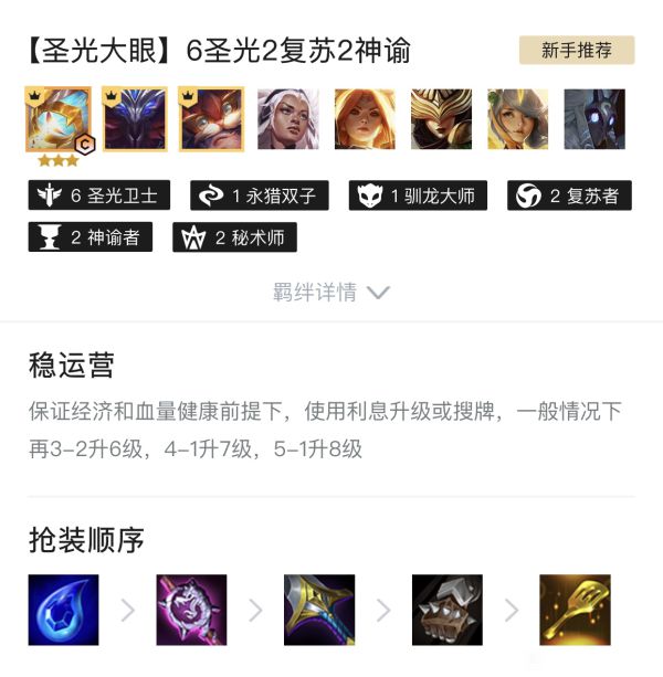 《云顶之弈》11.12版的圣光阵容有着非常强的吃分能力,那么苦于上分的玩家不妨看看下面由“原野趣”分享的《云顶之弈》11.12六圣光大眼阵容指南,希望能帮到大家。