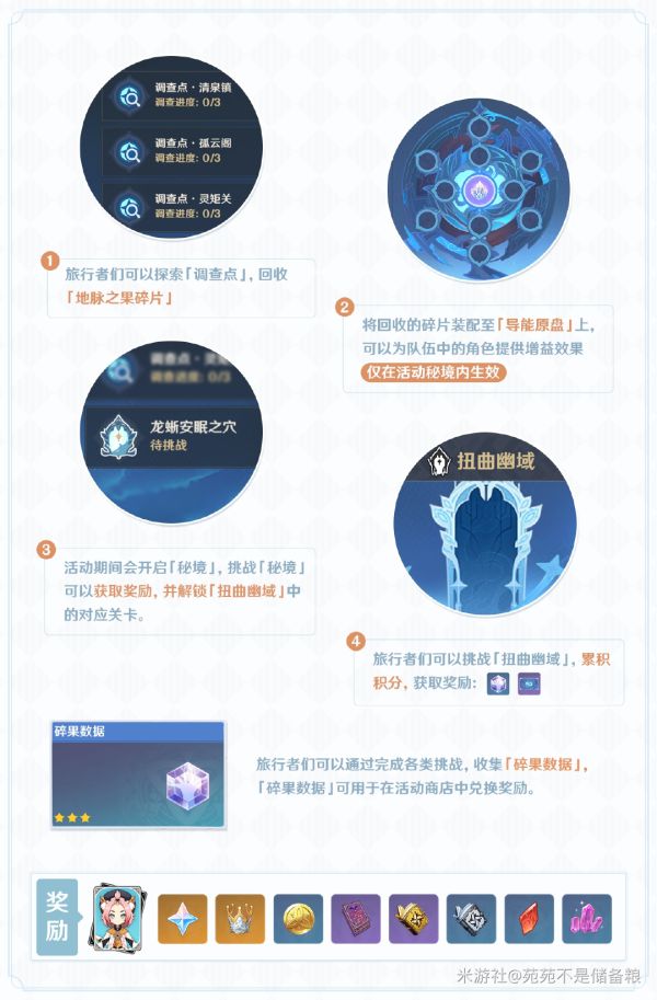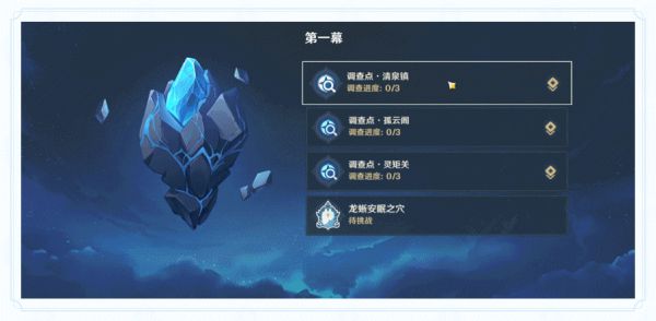 难度不高,第一幕开启时会开启三个调查点,之后每一幕开启时也会增加三个调查点,每个调查点内,包含3个地点。击败地点的敌人即可以回收[地脉之果碎片]和获取[碎果数据]
