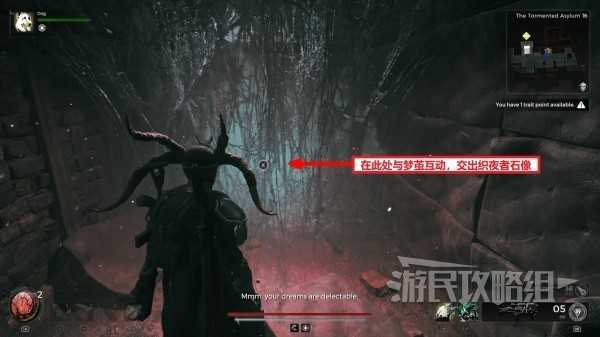 进入苦痛精神病院后,这里的地图与疗养院地图是一致的,在地下室寻找一个开着门的牢房,里面也有一个梦茧(发蓝光蓝色的网),与梦茧互动并交出【织夜者石像】,即可获得近战武器【捕梦者】。