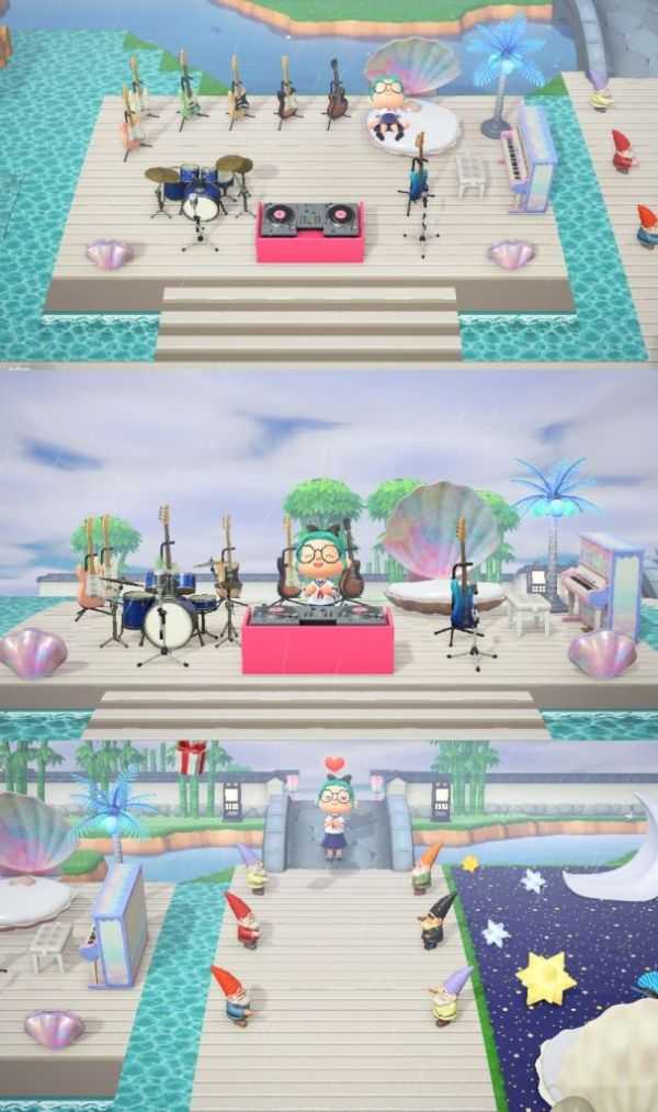 水上舞台,最开始是因为各色吉他太多了想要有个摆放的地方,不想开琴行所以建了舞台。贝壳和街头钢琴改色后很搭,粉嫩的颜色有爱上。