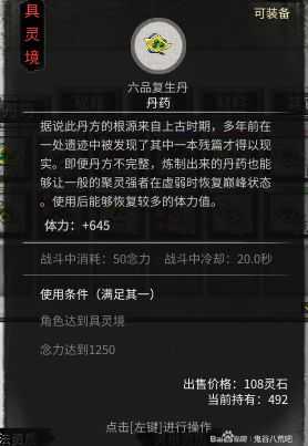 其中师傅数量加念力好像加的最多,各城镇和宗派去转,遇到好的就买下来修炼。基本到境界中期就可以吃到下个境界的丹药了,而且下境界6品丹药都要比当前境界1品丹药加的数量多。