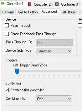 对所有设备挨个进行相似操作:在General页面下配置完映射后选择右侧的Advanced高级控制页面,勾选最下方的Combine this controller (组合使用此控制器),然后在combine into (组合至) 下拉选框中选择One。也可以是其他数,只要所有外设都选的一样就行。