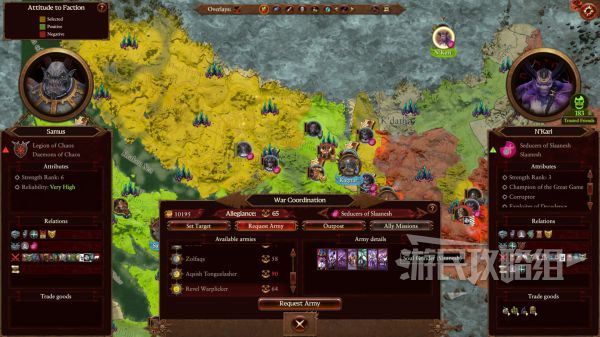 - 使用斯卡布雷德进行游戏时,由于恐虐派系没有远程兵种,所以攻城等战斗会打得非常难受,此时可以选择和奸奇派系结成盟友,这样就能招募对方的蓝色惧妖和粉色惧妖。