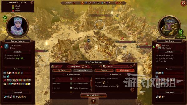 除此之外,完成外交面板上的一些任务也能够获得臣道点。通常情况下,盟友会请求我们消灭某个领主及其军队,完成后就能获得几十点臣道点数。盟友在战斗过程中还可能会要求我们也对其敌人发动进攻并在规定回合内将敌人消灭,达成目标后也能拿到臣道点。