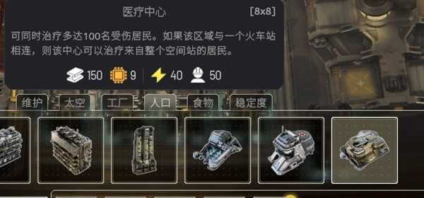 医疗中心收治100人,需要50/62人运转,消耗150合金、9芯片,占地8x8。