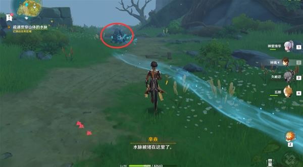 离开秘境之后,我们能看到一条很明显的水脉,跟随水脉的指引前往寻找水泉,跟着水脉一路往前走,我们发现了第一处被堵住的地方,击破岩石疏通水脉