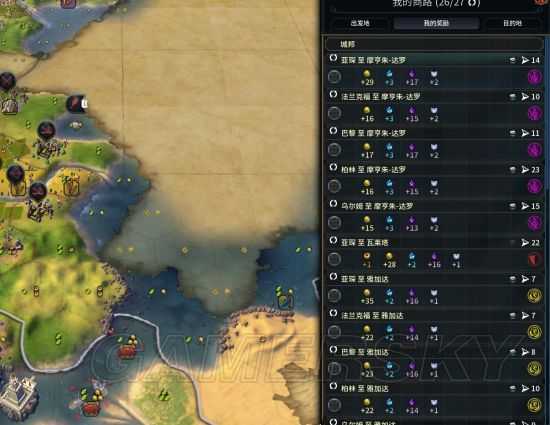 当时我次数只有5,6个城市,但是商路已经有了十多条,港口,军营,商会,一个城市给三条商路,如果连到城邦也能有100,200的文化产出,政策直奔商人帝国,四个主要城市优先涨人口,把区块拍下,尽量避免文化太快区块涨价,大概在120,到130回合,我的26条商路从4个主城连向7个城邦,文化瞬间爆炸到600多
