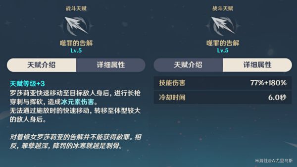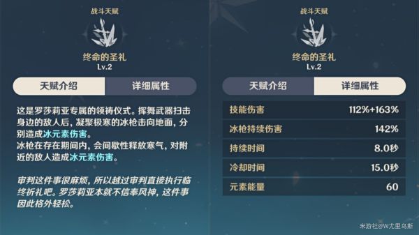 元素爆发具有不俗的伤害,而且可以持续8秒范围持续照成冰伤,挂冰。冷却时间也比较短,很适合速切打伤害,而且固有天赋里有说到释放大招给全队加暴击,罗莎莉亚的百分15%的暴击率(持续10秒)。比如你罗莎莉亚88暴击,然后吃到我们前面元素战技说到的用元素战技就能加12暴击,那么我们就100暴击的面板,这时候用大招就能吃满这个加成15的暴击。直接加全角色面板上面,但是不包括罗莎莉亚自己。