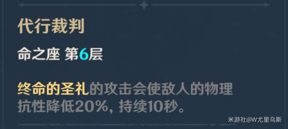 使用大招之后可以给敌人减物抗,这个技能对于玩物理的朋友就算如虎添翼,比如辅助优菈,雷泽等角色。这个命座在物理队伍里非常关键。
