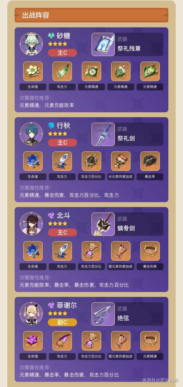 砂糖的圣遗物非常好选择。圣遗物完全不需要考虑双爆和攻击力,只需要考虑元素精通即可。