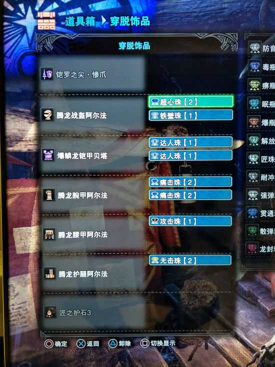 武器金惨爪枪,克制1会心1吸血,武器有40%会心,看破6有25%会心,攻击4有5%会心,弱点特效有30%会心,这样会心就满了,全程无限白斩不用磨刀爽爆。