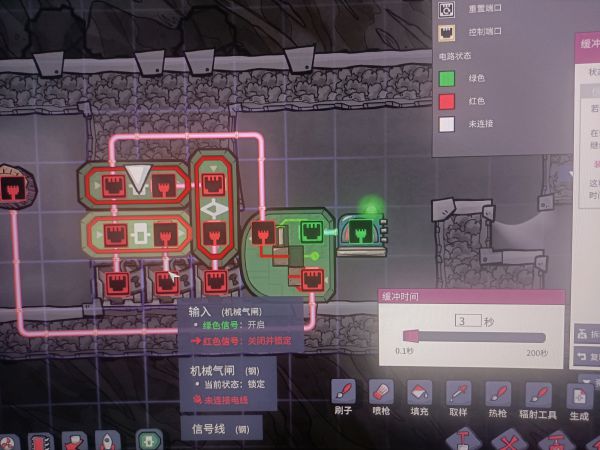 气压传感器设置为高于1000千克输出绿色信号,气泉就会一直喷发,等推气到低于1000千克时候,机械门就会停止工作