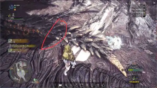 102只才出大小金,很非了。大家都知道刷历战和调查,因为我灭尽历战不多,大部分是刷调查。我是80只左右才开始用观察法的。灭尽会来回循环在地上摩擦,建议刷灭尽大小金的朋友,观察这个尾巴。这个图是灭尽在朝睡觉区摩擦的时候尾巴的位置截图,小金的大概在这个位置。